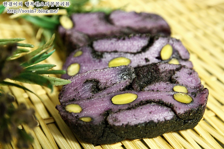 いよいよ型に餅を詰める工程です。型の内側にラップを敷き、その上に黒ごまパウダー70gを薄く敷きます。餅生地を型に入れる際は、ジグザグに、まるでツイストした編み込みのように交互に入れると、後で切ったときに美しい断面を見ることができます。型の中で餅の形を整え、しっかりと押さえてから、お好みの大きさに切り分ければ、美味しい紫芋の雲餅(クンピョン)の完成です!