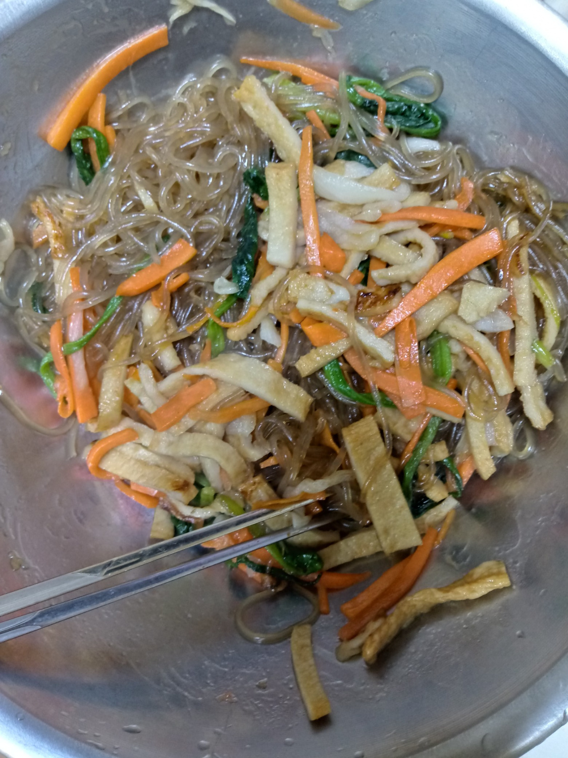 (ヒント:当初、水あめを15大さじ使用しましたが、醤油の味が強すぎると感じたため、さらに5大さじを追加して合計20大さじで再度炒めました。レシピでは水あめ20大さじを基準としていますが、お好みに合わせて量を調整することで、より完璧なチャプチェをお楽しみいただけます。)