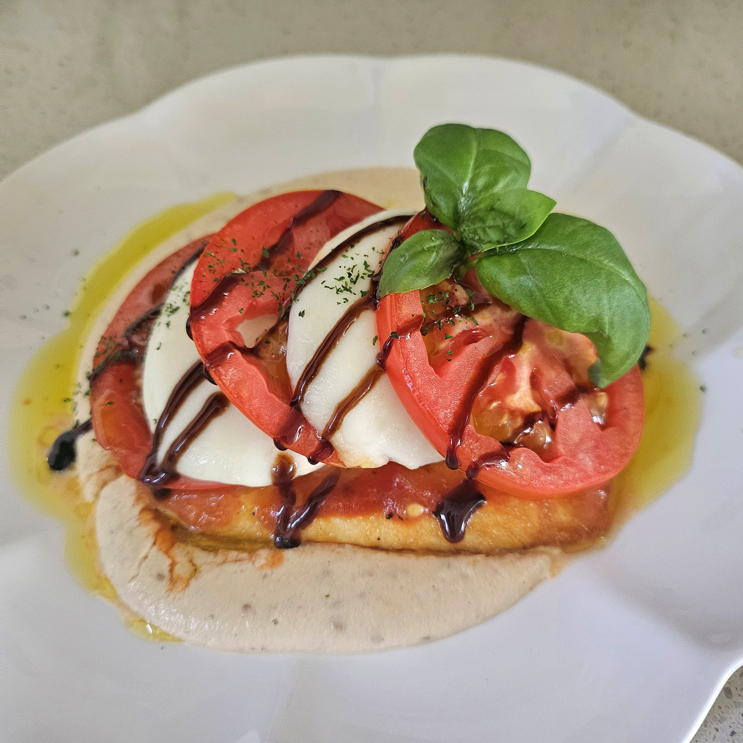 トマトソースの上に、スライスしたトマトとモッツァレラチーズを、重ねるように、または並べるように彩りよく乗せます。200℃に予熱したオーブンで約5分間焼きます。モッツァレラチーズが溶けすぎないよう、少しとろりとする程度に焼き上げるのがポイントです。