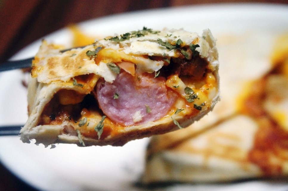トルティーヤが美味しそうにパリッと焼けたら完成です!このくらいの焼き色なら、中までしっかり火が通っています。このように簡単に、ソーセージトルティーヤロール、またはトルティーヤホットドッグの完成です。おうちで楽しむ最高のおつまみですよ!