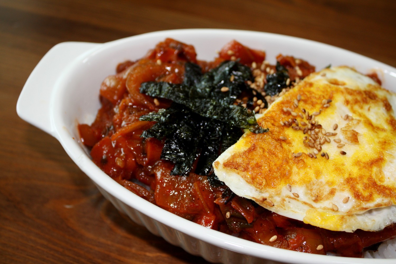完成したキムチ丼のタレを温かいご飯の上にたっぷりかけ、香ばしい刻み海苔と、とろりとした目玉焼きをきれいに乗せれば、見た目も食欲をそそる「ヨンニョミ」特製キムチ丼の完成です。簡単なのに満足感たっぷりの一食をぜひお楽しみください!