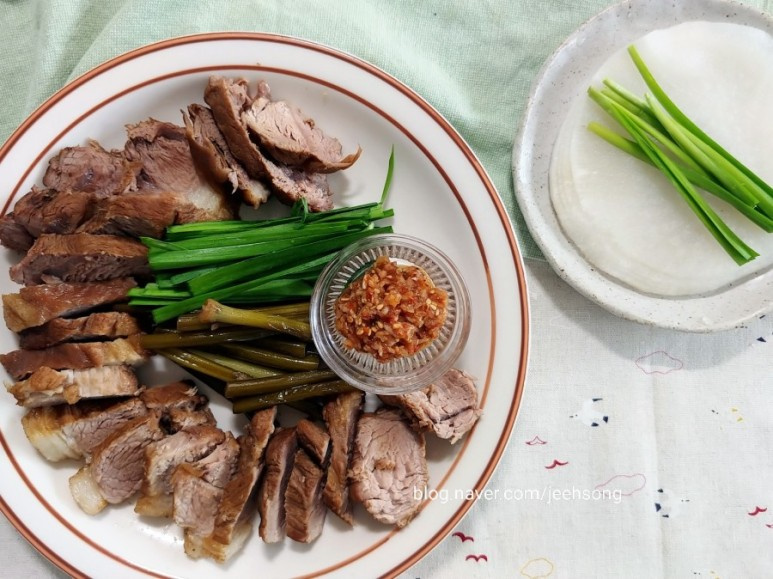 スライスしたスユクを盛り付け皿にきれいに並べます。一緒に茹でたニンニクの芽(あれば)、新鮮なニラ、そして丁寧に作ったエビ味噌ソースを添えます。甘酢漬けの大根と一緒に包んで食べると、さらに美味しくいただけます。ボリューム満点で美味しい手作りスユクをぜひお楽しみください!