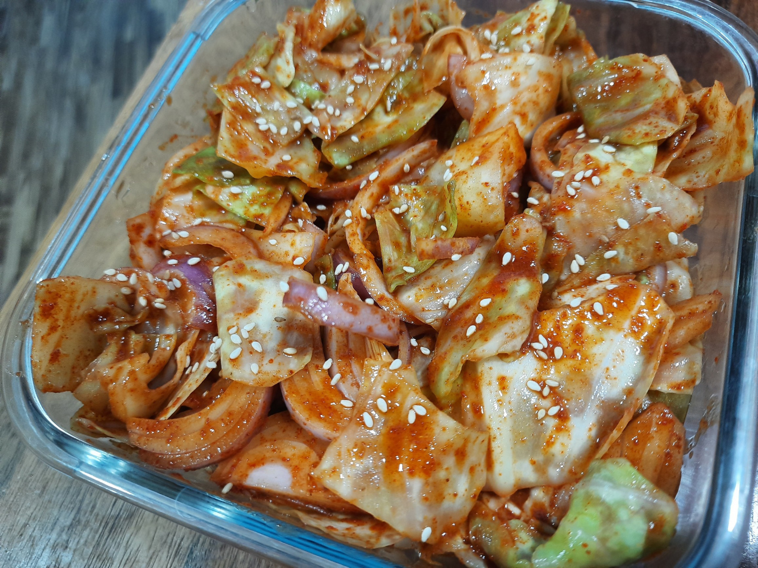 水気を絞ったキャベツを、調味料に漬けておいた玉ねぎと一緒にボウルに入れ、調味料がキャベツ全体に均一に絡むように、優しく混ぜ合わせます。キムチが完成したら、きれいな器に盛り付け、炒りごまを振りかけて見た目を整えて完成です 🙂 すぐに食べても美味しいですが、常温で一晩ほど置いてから冷蔵庫で保存すると、より深い味わいを楽しめます。