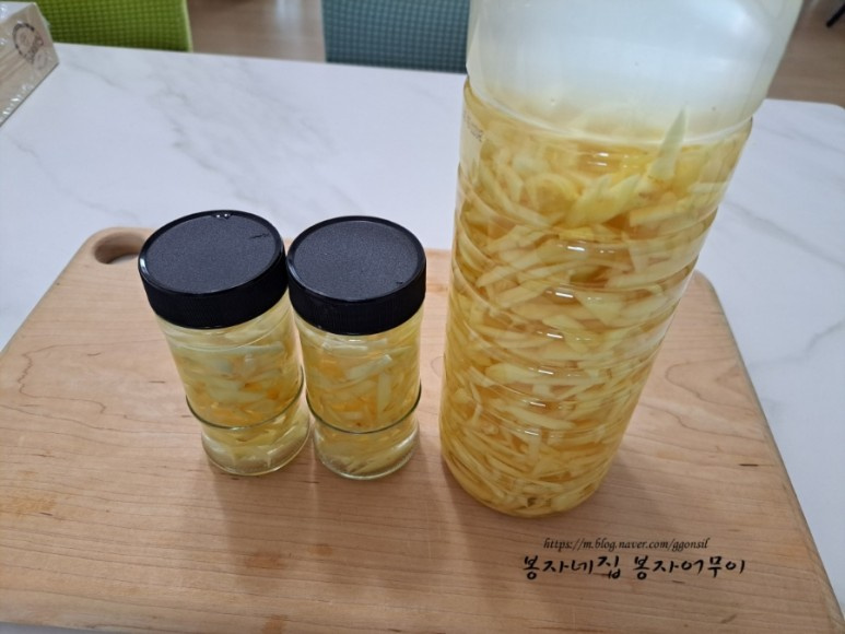 水気をしっかり切った生姜は、薄くスライスします。できるだけ細く千切りにすると良いでしょう。生姜酒の作り方にはいくつか方法があります。すりおろして入れる方法、このように薄くスライスして入れる方法、または生姜シロップを作ってそのエキスを使う方法もあります。私は普段、玉ねぎシロップをよく使うので、生姜酒を作る際は、このように薄切りにして直接漬け込む方法を好んでいます。皆さんも、お好みに合わせて方法を選んでみてください。