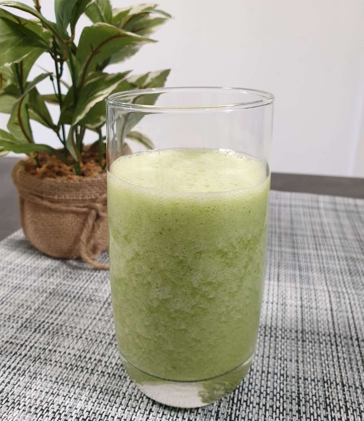 滑らかになったチンゲン菜バナナジュースを、おしゃれなグラスに注ぎます。このジュースは、血管の健康をサポートし、お肌を美しくする効果があると言われています。ただし、腎臓に疾患がある方はカリウムの摂取に注意が必要な場合があるので、摂取前に専門家にご相談することをおすすめします。美味しく、健康的に楽しんでくださいね!