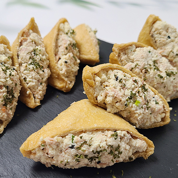 油揚げを優しく広げ、破れないように注意しながら、混ぜ合わせた豆腐とツナの具材をたっぷりと詰めていきます。これで、美味しさと栄養を兼ね備えた、豆腐とツナのヘルシーいなり寿司風の完成です!一口サイズにすると食べやすいですよ。