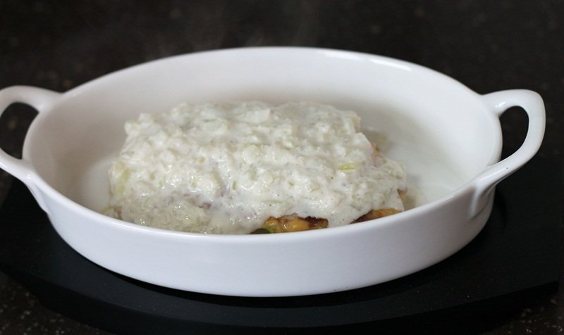 最後に、温めておいたクリーミーソースを、焼きあがったお肉の上からたっぷりとかけます。コクのあるクリーミーソースが、お肉と野菜の旨味をさらに引き立て、料理の完成度を高めてくれます。熱々を召し上がれ!