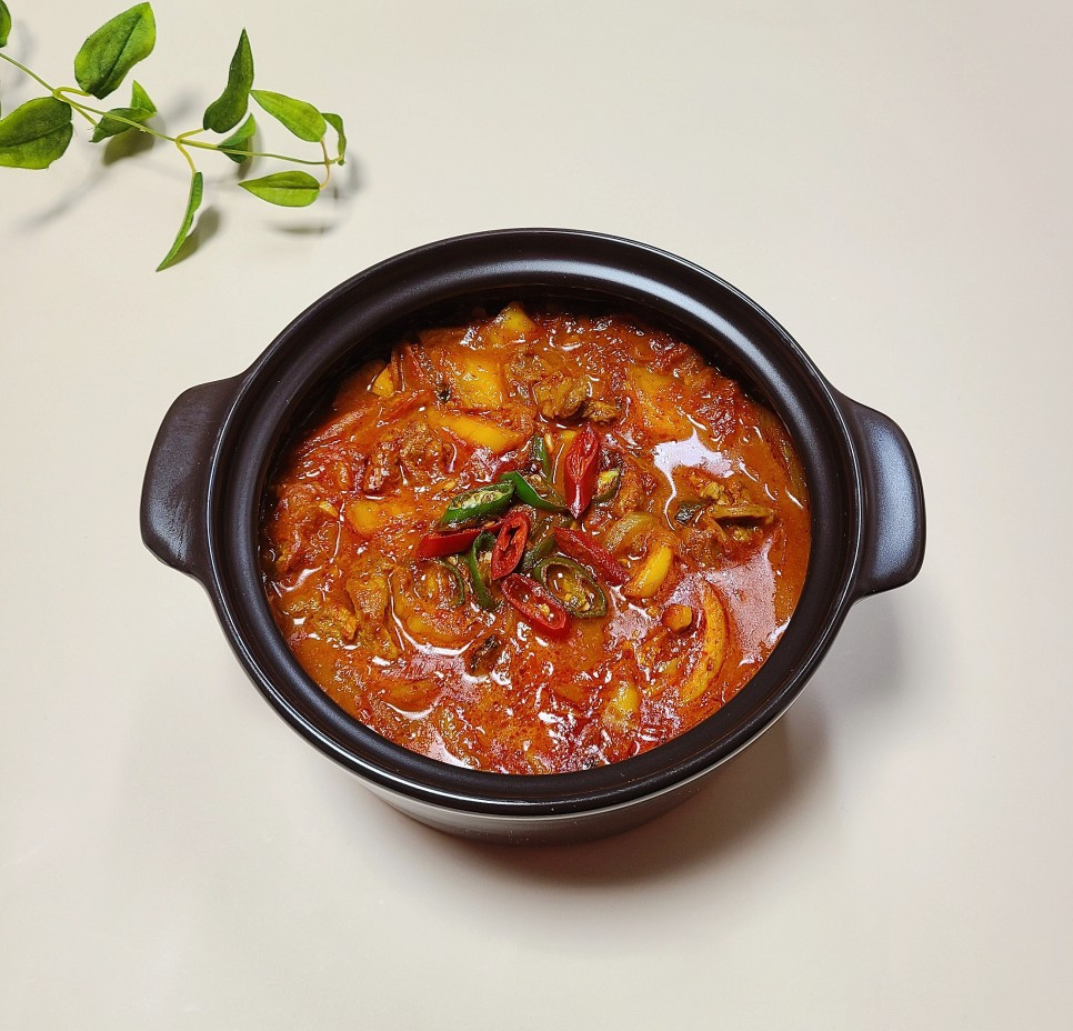 最後に、斜め切りにした青唐辛子を加え、ひと煮立ちさせたら、ピリ辛で濃厚な豚肉キムチチャグルチの完成です!青唐辛子の爽やかな辛味が、チャグルチの刺激をさらに引き立てます。