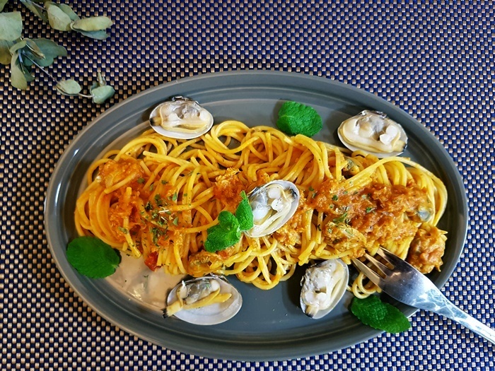片方の殻だけ残したアサリを5個ほど、パスタの周りに見栄え良く飾ります。新鮮なミントの葉を数枚添えると、彩りと爽やかな香りが加わり、見事なパスタの完成です。