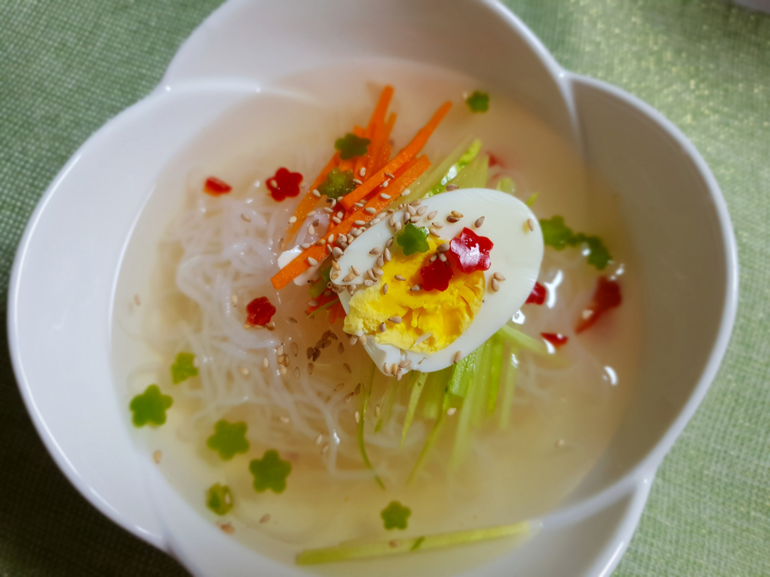 準備した冷たいこんにゃく麺をスープの入った器にそっと入れます。その上に、千切りにしたきゅうりとにんじん、半分に切ったゆで卵をきれいに盛り付けます。辛味を加えたい場合は、薄切りにした青唐辛子を、彩りを加えたい場合は赤唐辛子の輪切りを少々添えて飾りましょう。最後に、香ばしさを加えるためにごまをパラパラと振りかければ、ひんやり美味しい超簡単こんにゃく麺の完成です!