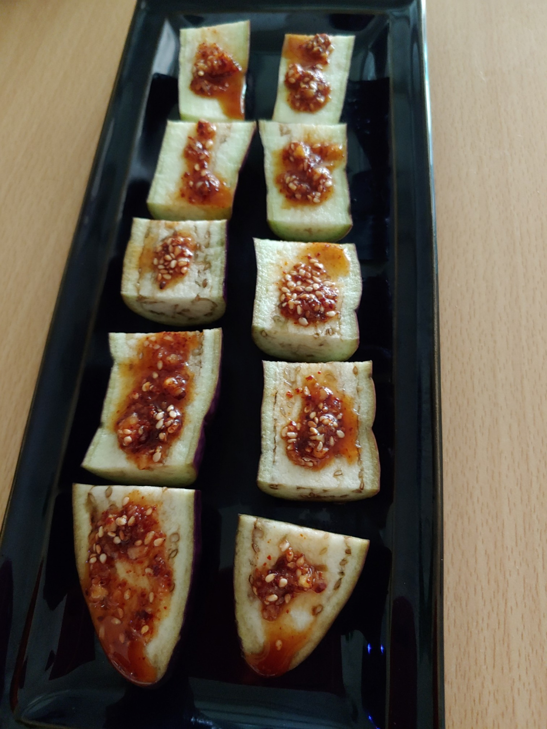 ナスが蒸れる間に、美味しい合わせ調味料を作りましょう。小さなボウルに醤油大さじ1、梅シロップ(またはみりん)大さじ1、にんにくのみじん切り小さじ1、コチュジャン(または一味唐辛子)小さじ1、そして香ばしさを加える白ごま小さじ1をすべて入れて、よく混ぜ合わせます。(※この調味料の分量は、ナス3本分としても十分な量です。余った調味料は密閉容器に入れて冷蔵庫で保存し、次回のナス料理や他の料理に活用してください。)