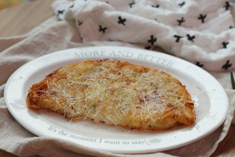 焼きあがったチーズポテトチヂミをお皿に移し、キッチンペーパーでフライパンに残った余分な油を軽く吸い取ります。最後に、パセリのみじん切りを散らし、お好みでグラナパダーノチーズをすりおろしてかけたら、見た目も華やかな雪花チーズポテトチヂミの完成です!熱々を召し上がるのが一番のおすすめですよ!