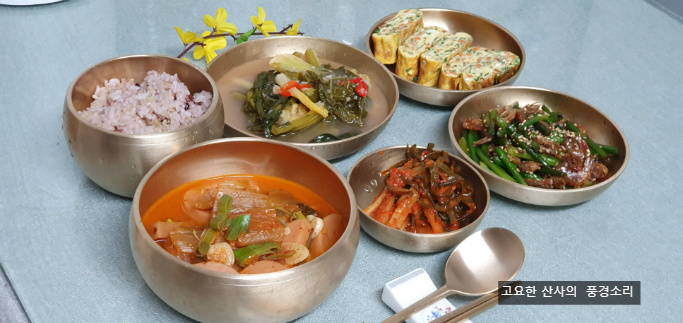 風味豊かなニンニクの芽とエビの炒め物、ふんわり卵焼き、ピリ辛ソーセージキムチチゲ