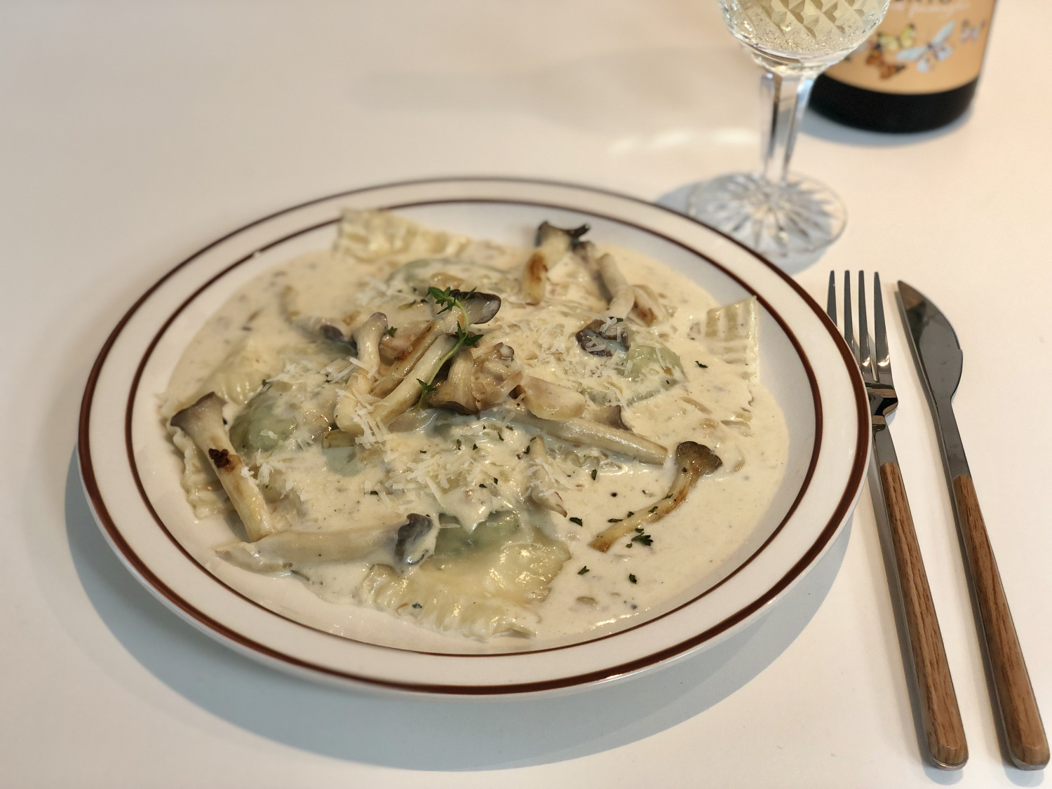 美味しいきのこクリームラビオリの完成です!温かいお皿に盛り付ければ、もちもちのラビオリと香り高いきのこクリームソースのハーモニーを楽しむ準備は万端です。新鮮なハーブや、追加のパルミジャーノチーズを添えて、さらに豪華に楽しんでみてください。どうぞ召し上がれ!