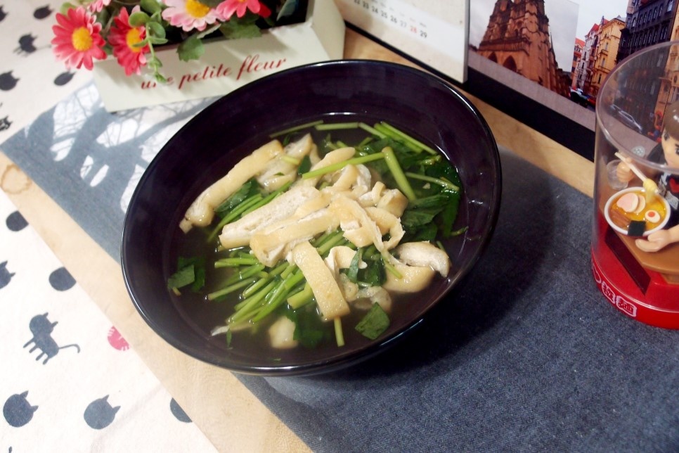 水分を完全に除去した油揚げは、薄く細切りにします。汁物に入れると油揚げが膨らむため、細く切ることで食感がより良くなります。