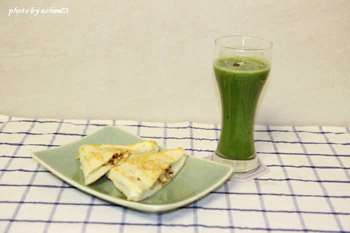 フライパンを弱火にかけ、食パンを乗せて、両面がきつね色になり、少しカリッとするまで焼いていきます。ハチミツが入っているので焦げ付きやすいので、火加減に注意しながらゆっくりと焼いてください。中身はすでに準備ができているので、長く焼く必要はありません。外側がカリッとし、中が温まればOKです。焼きあがったホットクは食べやすい大きさにカットし、さっぱりとしたほうれん草とイチゴのスムージーを添えれば、栄養満点の美味しいおやつになりますよ。