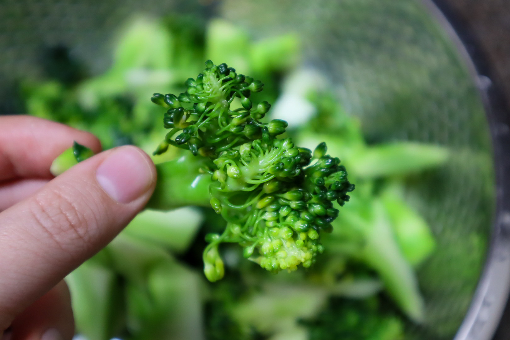 最後に、冷たい水から取り出したブロッコリーの水気を、軽く「トントン」と振って切ると…!