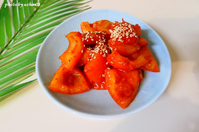 あらかじめ作っておいた美味しいヤンニョムを、トマトの上に均一にかけます。調味料がトマト全体にしっかり絡むようにしてください。