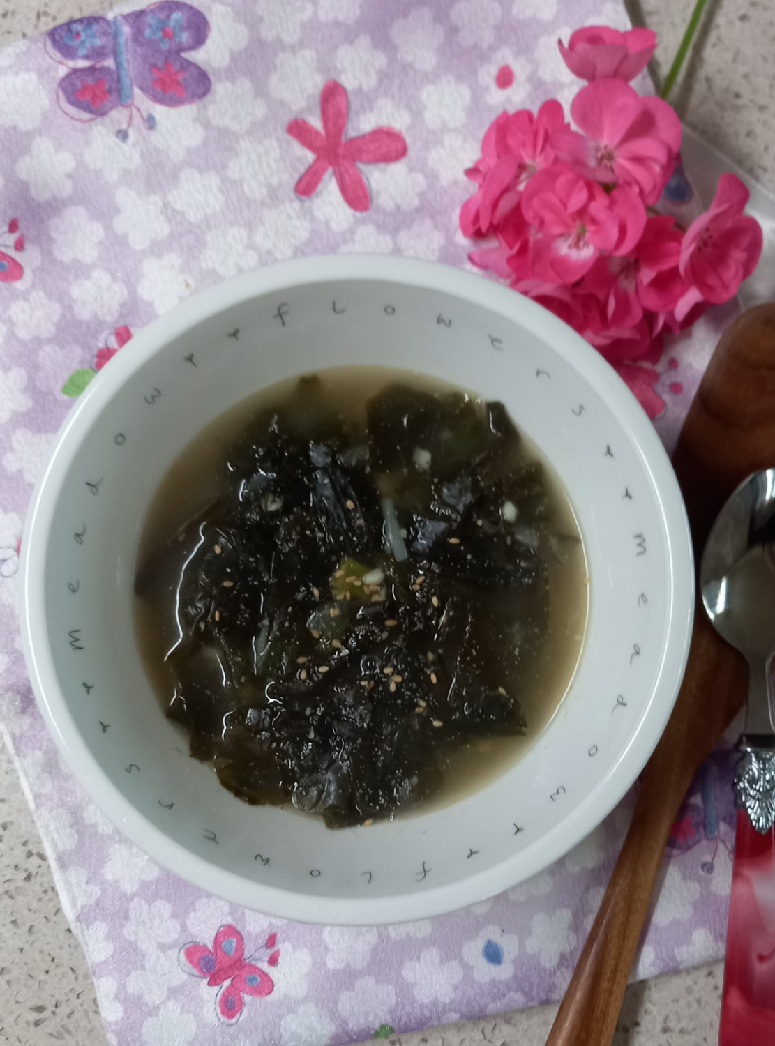 心を込めて作った香ばしいエゴマ若布スープを器に盛り付ければ、美味しい健康食の完成です。