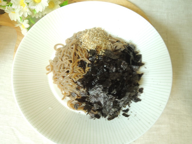 器に水気を切ったそばの実麺をきれいに盛り付けます。その上に、準備しておいた焼き海苔を細かくちぎって散らし、すりごまをたっぷりとかけます。最後に、作ったエゴマ油ソースを回しかければ、美味しいエゴマ油のそばの実麺の完成です!よく混ぜて、召し上がれ。