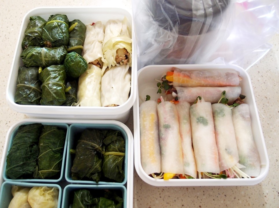 肉巻きの最後の工程として、シャキシャキしたキャベツの葉でもくるくると巻けば、様々な味の肉巻きが完成します。