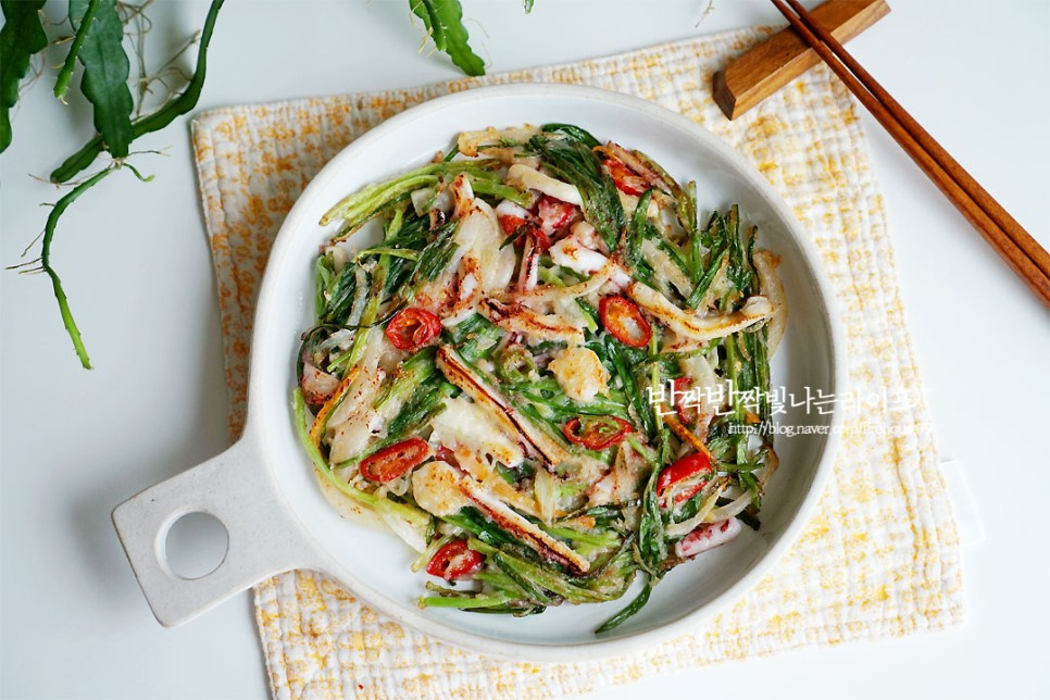 新鮮なニラの香りと、プリプリの海鮮の旨味が絶妙に絡み合う、マッコリがすすむこと間違いなしのニラと海鮮のチヂミです。油を多めに使い、カリッと香ばしく揚げ焼きにすることで、誰もが大好きな絶品おつまみが完成します。特別な日や雨の日にも、ぜひ作ってみてください!