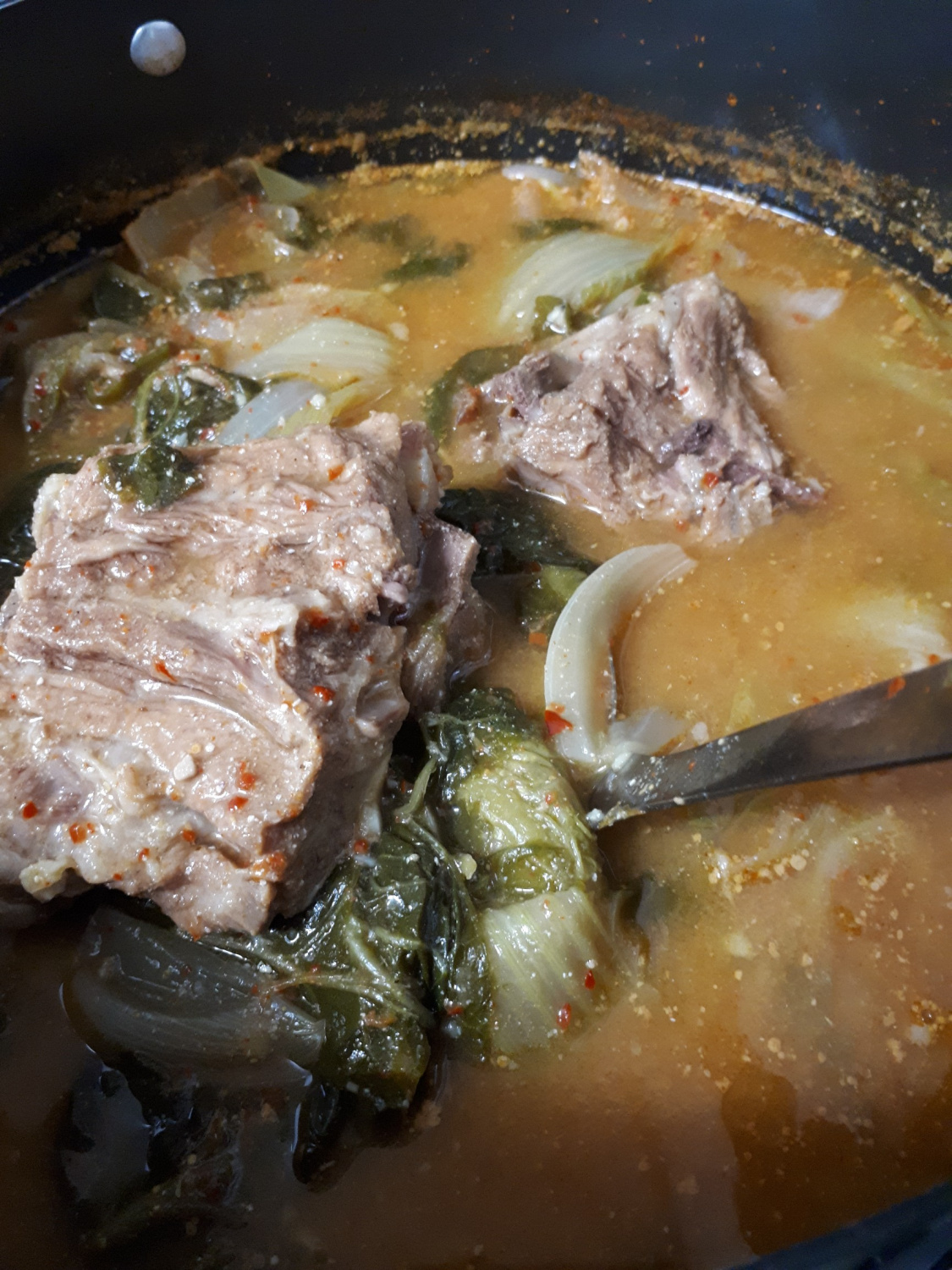 子供たちは普段あまり食べない白菜の漬物(ウガジ)も、不思議とこのチゲ(ヘジャンクク)にはご飯と一緒にとてもよく食べてくれるんです!お子さんの偏食が気になるなら、この豚背肉チゲ(ヘジャンクク)を頻繁に作ってあげるのも良い方法です。大きな鍋にたっぷり作っておけば、心強い一食になりますよ。笑