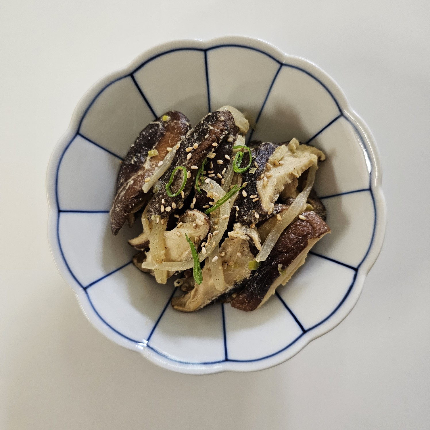 出来上がった干し椎茸のえごま炒めを、器に美味しそうに盛り付けます。最後に、香ばしさをプラスし、見た目の美しさを引き立てる炒りごまを軽く振りかければ、味、栄養、香りのすべてを兼ね備えた素晴らしい料理が完成です!