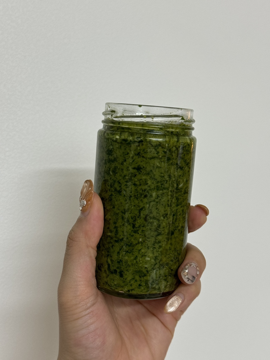 出来上がったバジルペストを消毒済みのガラス瓶に詰めます。この時、ペストの表面に空気が入らないように、しっかりと押し込むように詰めるのがおすすめです。最後に、ペストの表面をオリーブオイルで完全に覆ってください。こうすることで、バジルの新鮮な風味と香りを長く保つことができます。使うたびにオリーブオイルの層を避けて使ってください。