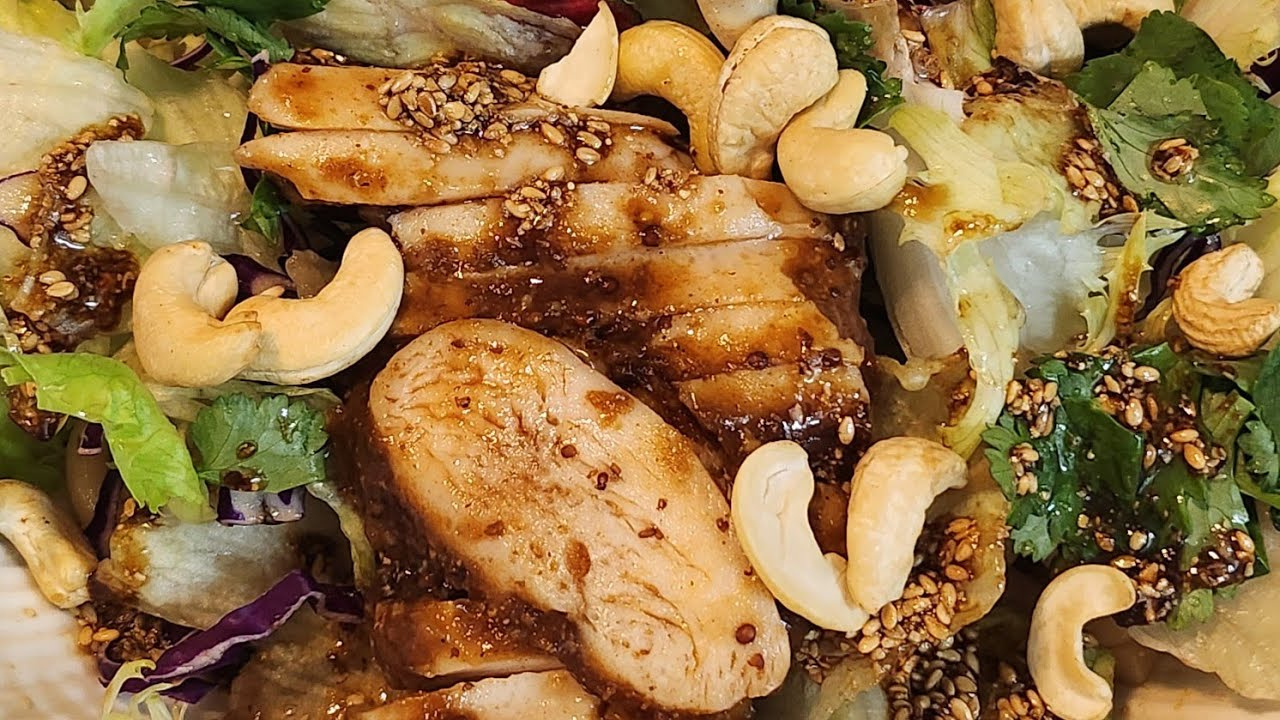 最後に、用意した鶏むね肉と香ばしいカシューナッツを彩りよくトッピングすれば、さっぱりヘルシーな鶏むね肉の冷やしうどんサラダの完成です!お好みではちみつを少々追加して甘さを調整しても美味しいですよ。どうぞ召し上がれ!