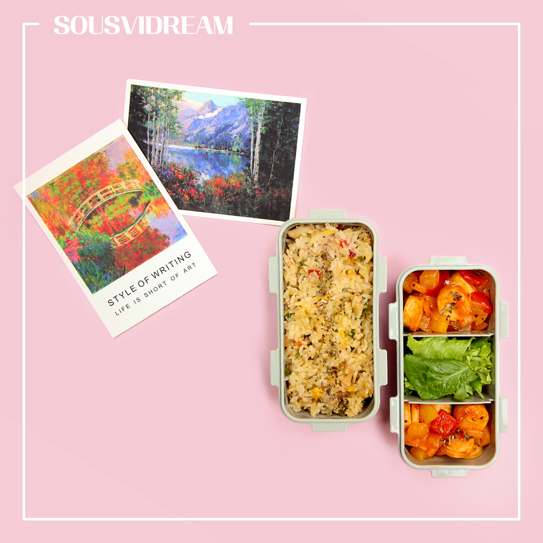 最後に、炒めた具材とスビードリーム 鶏むね肉チャーハン1袋を電子レンジ対応の容器に入れ、電子レンジで3分加熱すれば、すべての工程が完了です!温かく美味しい鶏むね肉チャーハン弁当を5分以内に完成させることができます。本当に簡単ですよね?