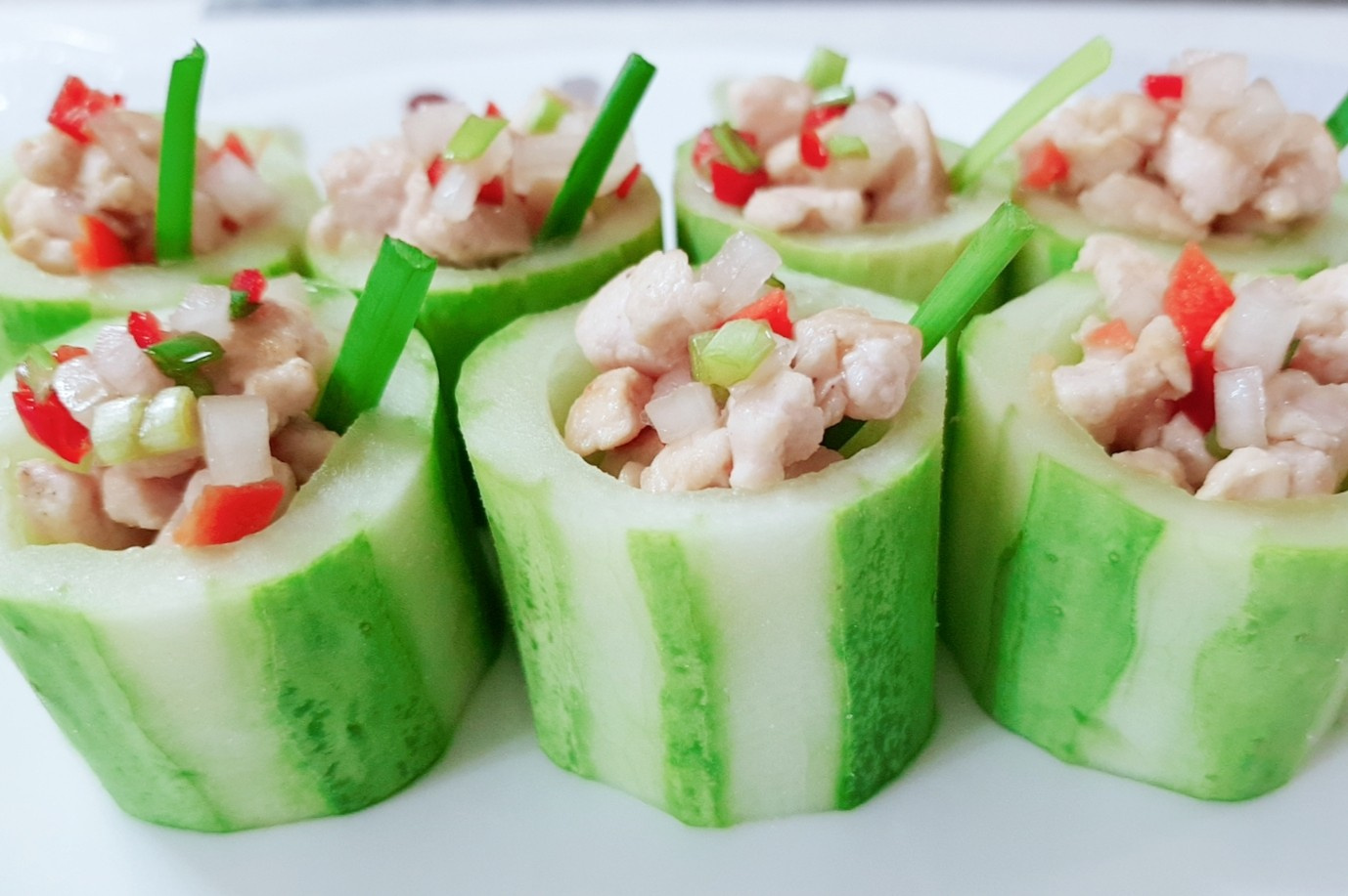 最後に、ニラをきれいに洗い、飾りとして1〜2本ずつ、詰め物をしたきゅうりの上に挿してください。鮮やかな彩りが加わり、さらに美味しそうに見えます。このように簡単で楽しいお子様のお料理、フィンガーフードスタイルの鶏むね肉ときゅうりのピクルスが完成しました!お子様と一緒に作った特別な軽食をお楽しみください。
