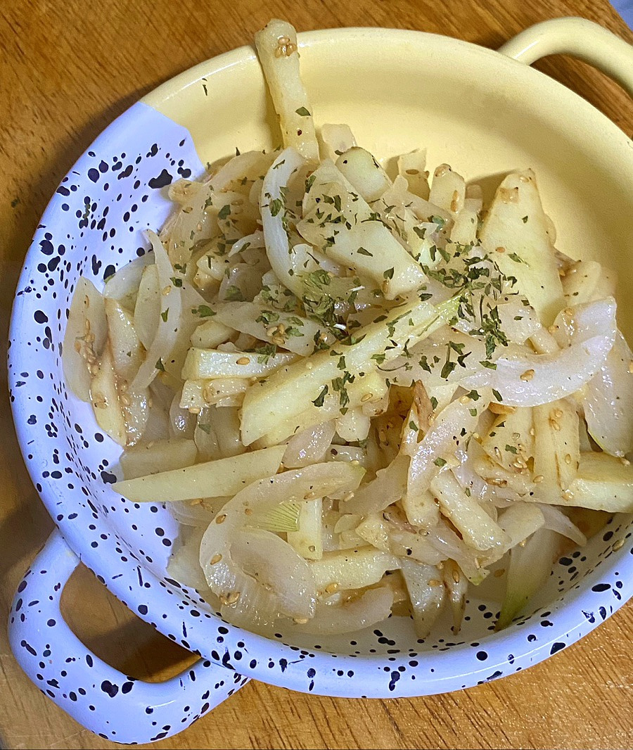 最後に、香ばしいいりごま大さじ0.5をパラパラと散らせば、美味しいポテトスティック炒めの完成です!温かいご飯と一緒に美味しく召し上がってください。