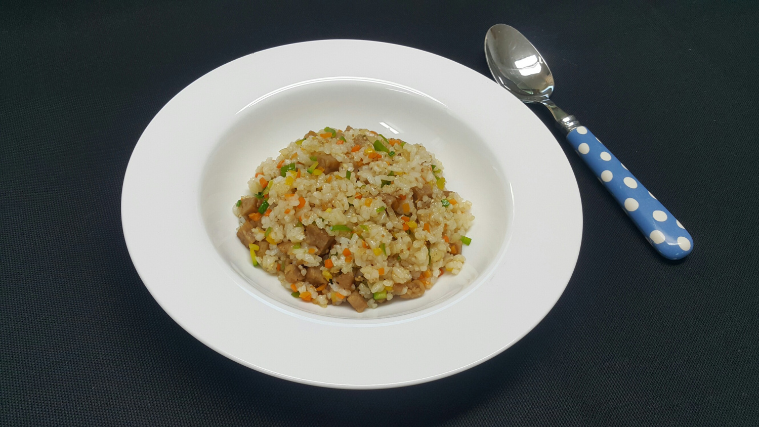 野菜とミートジョンが程よく炒まったら、ご飯を加えて、ヘラなどでご飯の塊をほぐしながら全体を均一に炒め合わせます。ご飯粒がパラパラになるまでしっかり炒めるのがポイントです。