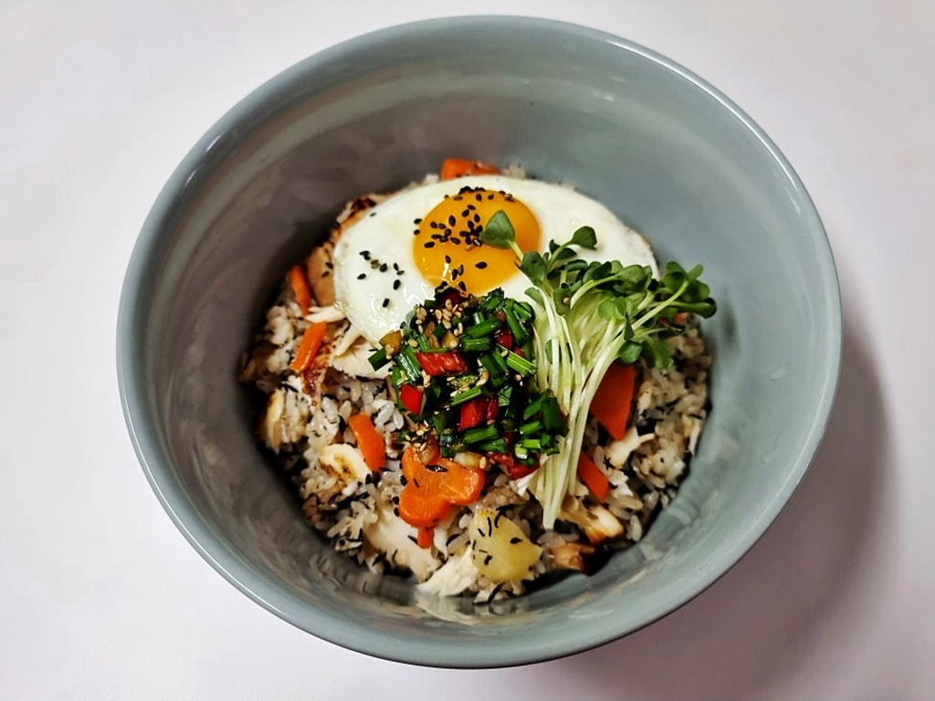 香ばしく焼いた halibutとニンニクを加えて調理した、深い旨味と香ばしさが特徴の特別なご飯料理です。海藻や椎茸など、栄養価の高い食材をたっぷり使い、美味しさと栄養を兼ね備えた一品です。満足感のあるヘルシーな食事にぴったりです。